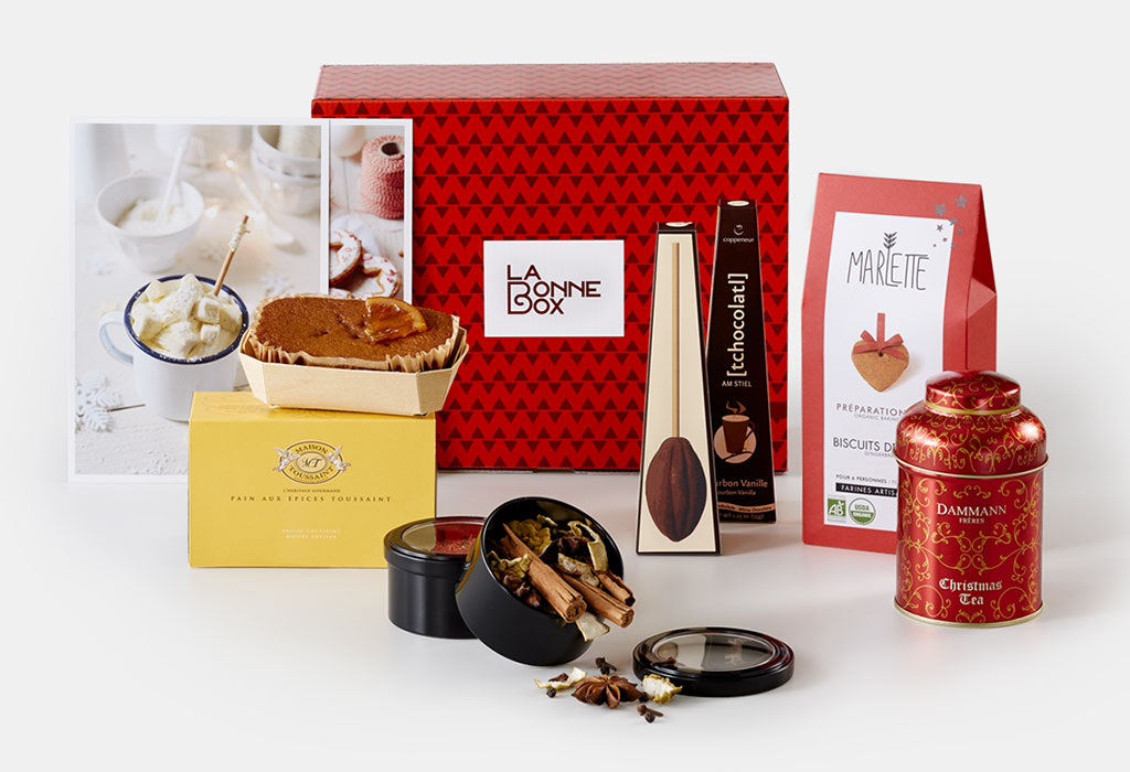 Ce n’est qu’en noël 2016, une fois que nous avions réussi à amortir les coûts et à accroître notre nombre d’abonnés, que nous avons fait évoluer de nouveau la box. Cette fois-ci, il fallait taper fort, et je voulais proposer un véritable coffret gourmand. Afin de faire comprendre cette idée, il fallait une grande campagne de communication, ainsi qu’une nouvelle boîte rigide, qui fasse penser à un coffret. Mais également sortir du gabarit traditionnel, avec nos prises de vue de face, et ne plus mettre la box en arrière plan, mais prendre une vue de plongée en mettant chaque objet à plat sur un support, afin de bien distinguer chaque produit individuellement, la box étant devenue un produit à part entière, et ainsi montrer une cohérence globale.