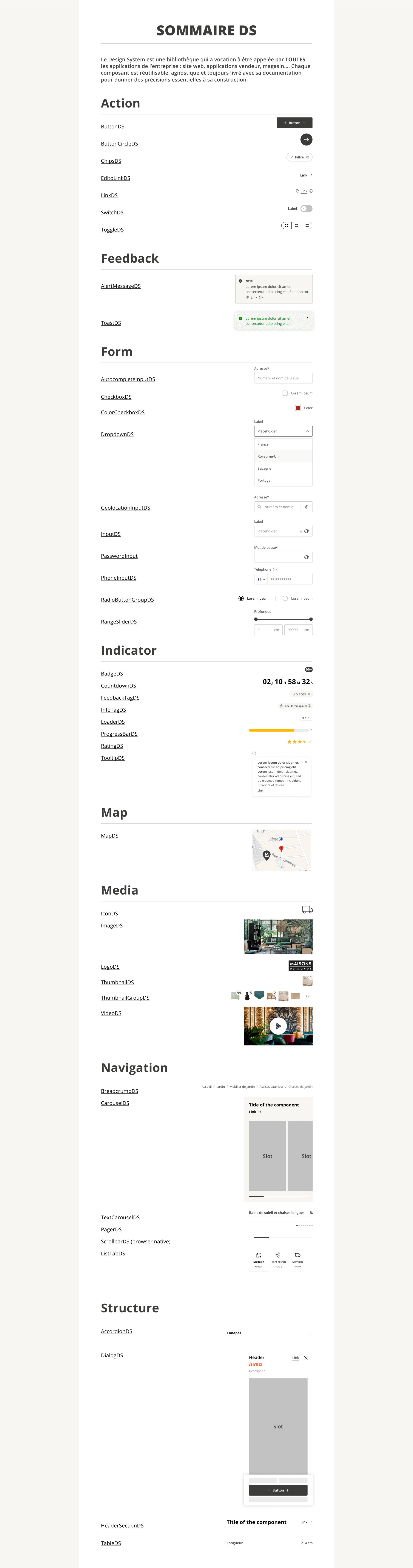 Une fois les règles de nommage posées, nous avons structuré la bibliothèque de composants Front de manière à la rendre claire, transverse et accessible pour tous les profils : développeurs, designers, PO, etc.